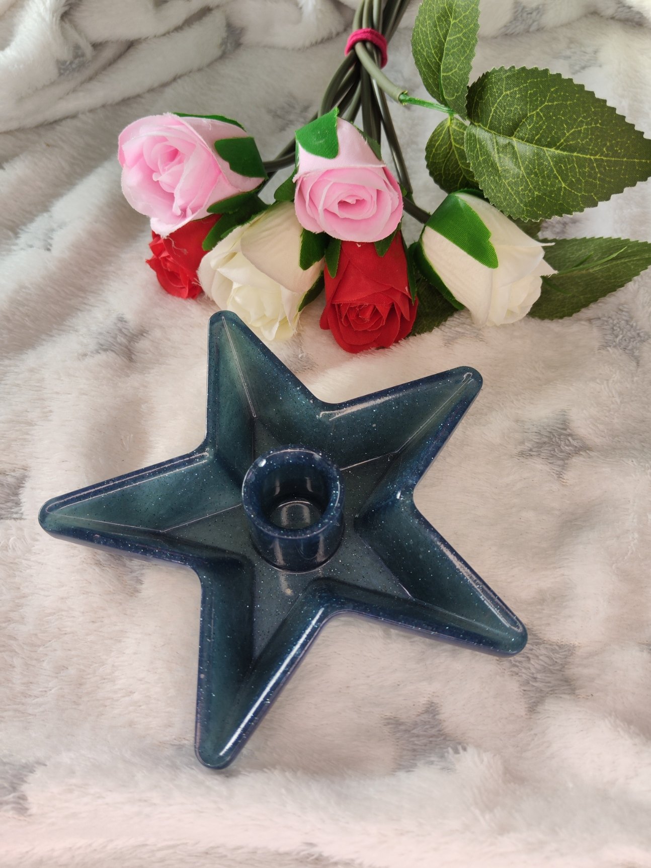 Ajoutez une touche d’élégance et de douceur à votre intérieur avec ce magnifique bougeoir en résine, façonné à la main. Cette merveille bleue marine avec paillettes est non seulement une œuvre décorative unique, mais aussi un objet pratique grâce à sa forme pouvant servir de bougeoir pour bougies led.