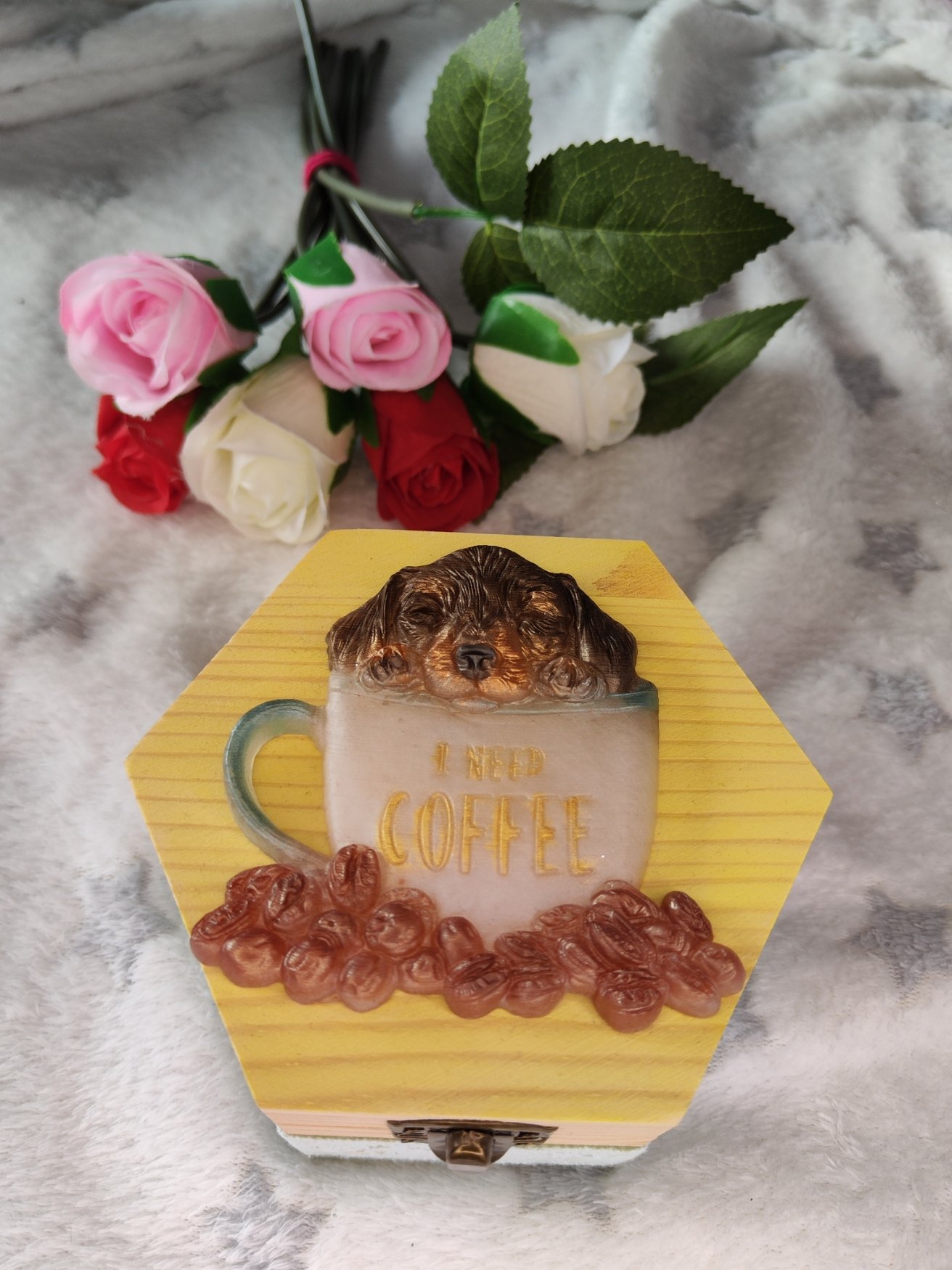 Ajoutez une touche d’élégance et de douceur à votre intérieur avec ce magnifique coffret avec son chien en résine, façonné à la main. Cette merveille est non seulement une œuvre décorative unique, mais aussi un objet pratique grâce à sa forme pouvant servir de vide-poche ou de porte-bijoux.