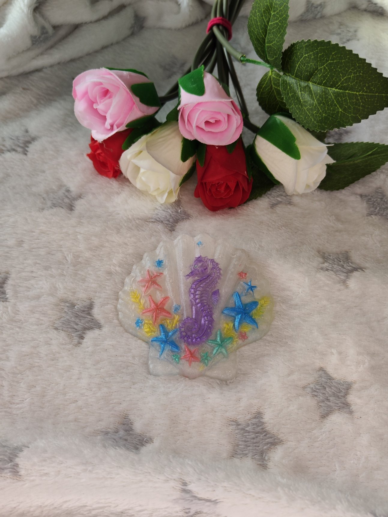 Coquille Saint Jacques décorée et son chevalet – Fabrication artisanale unique en résine epoxy