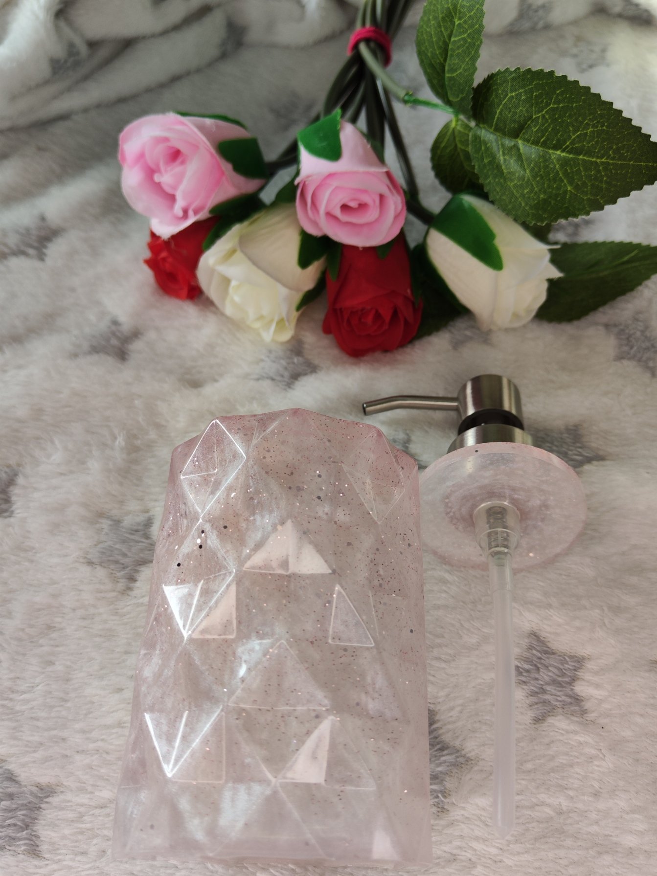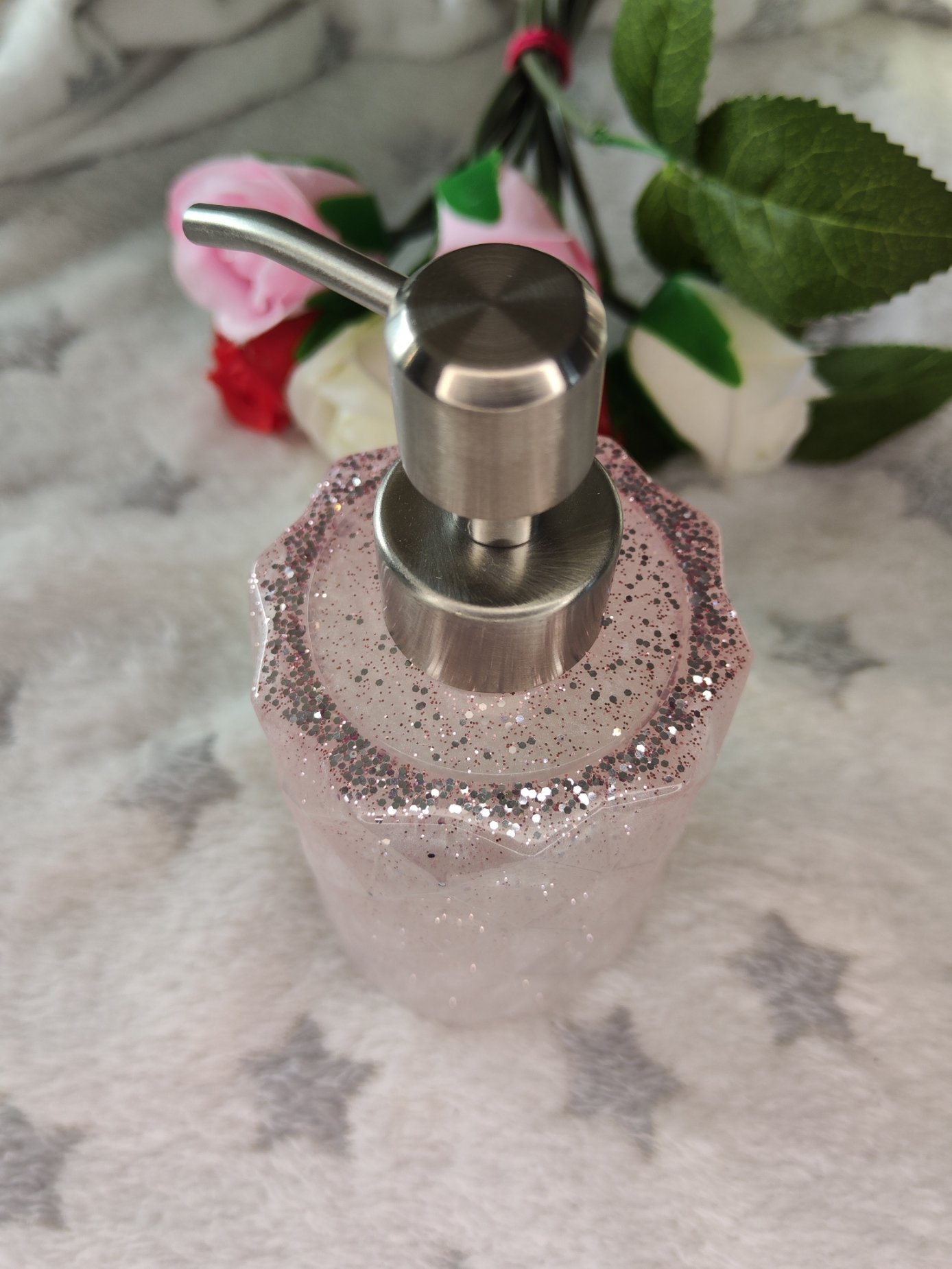 Ajoutez une touche d’élégance et de douceur à votre intérieur avec ce magnifique distibuteur de savon en résine, façonné à la main. Cette merveille blanche avec paillettes roses est non seulement une œuvre décorative unique, mais aussi un objet pratique .