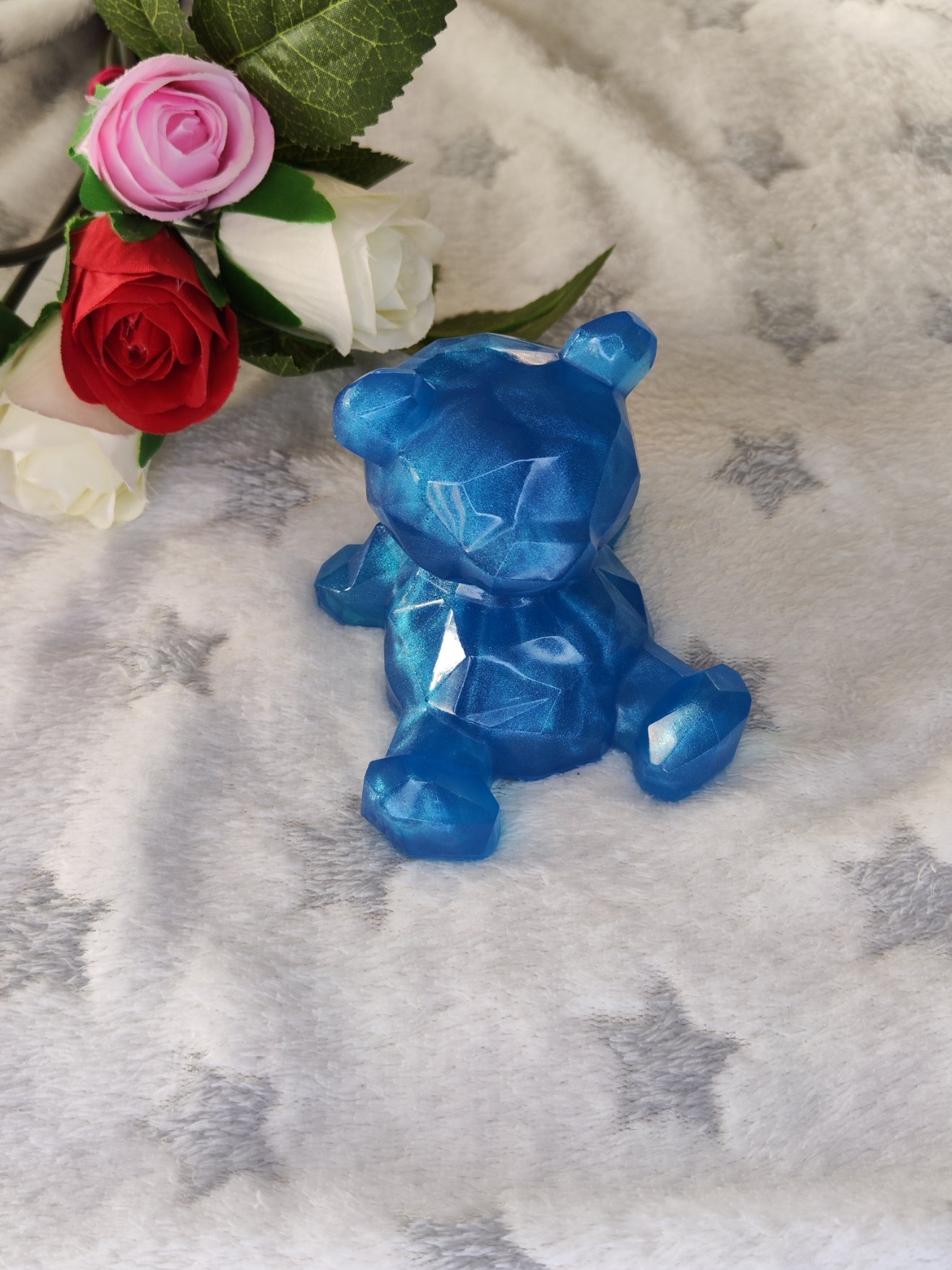Ajoutez une touche de douceur à votre intérieur avec ce magnifique ours à facettes en résine, façonné à la main. Cette merveille bleue est non seulement une œuvre décorative unique, mais aussi un objet pratique grâce à sa forme pouvant servir de porte téléphone.
