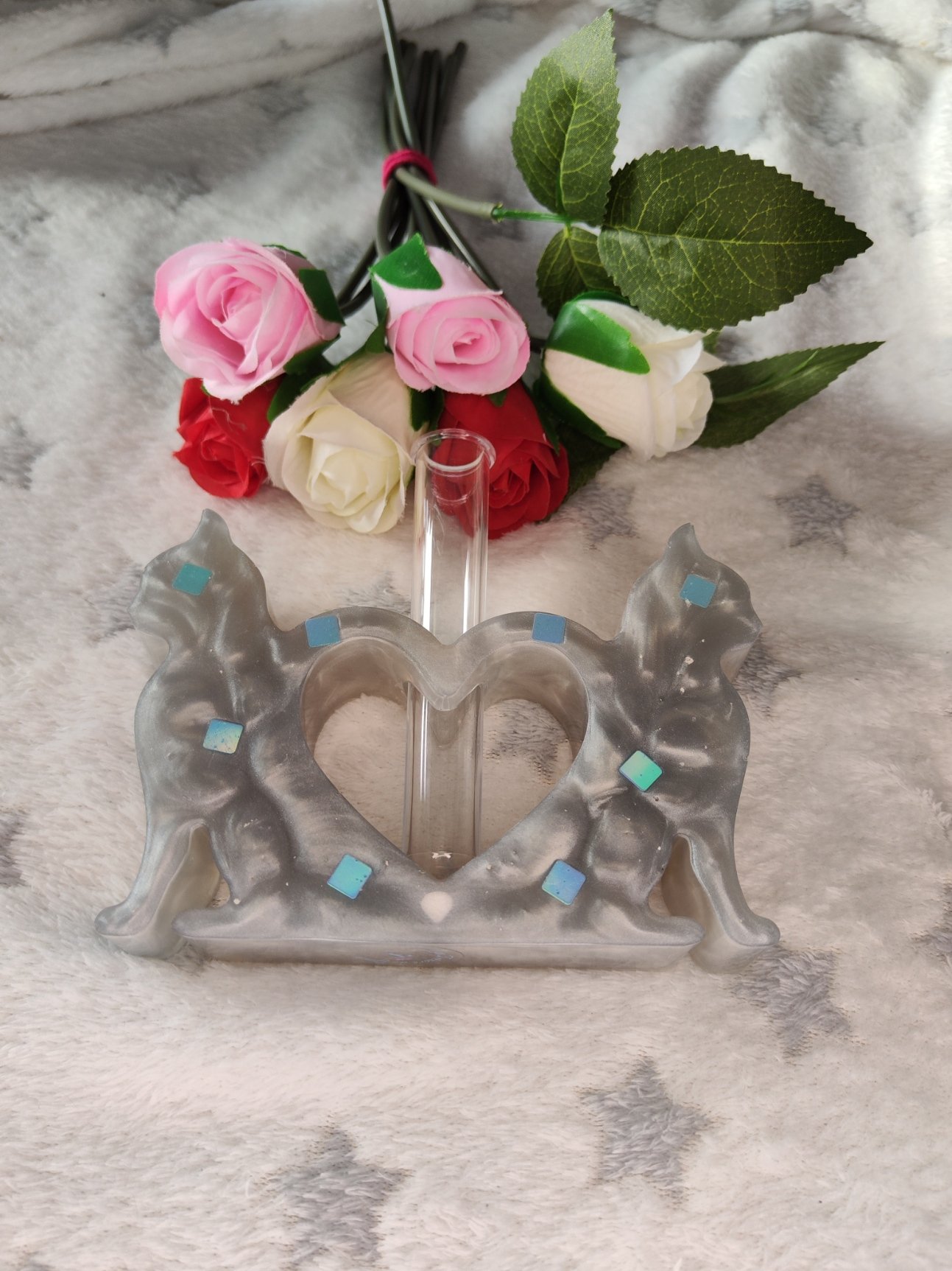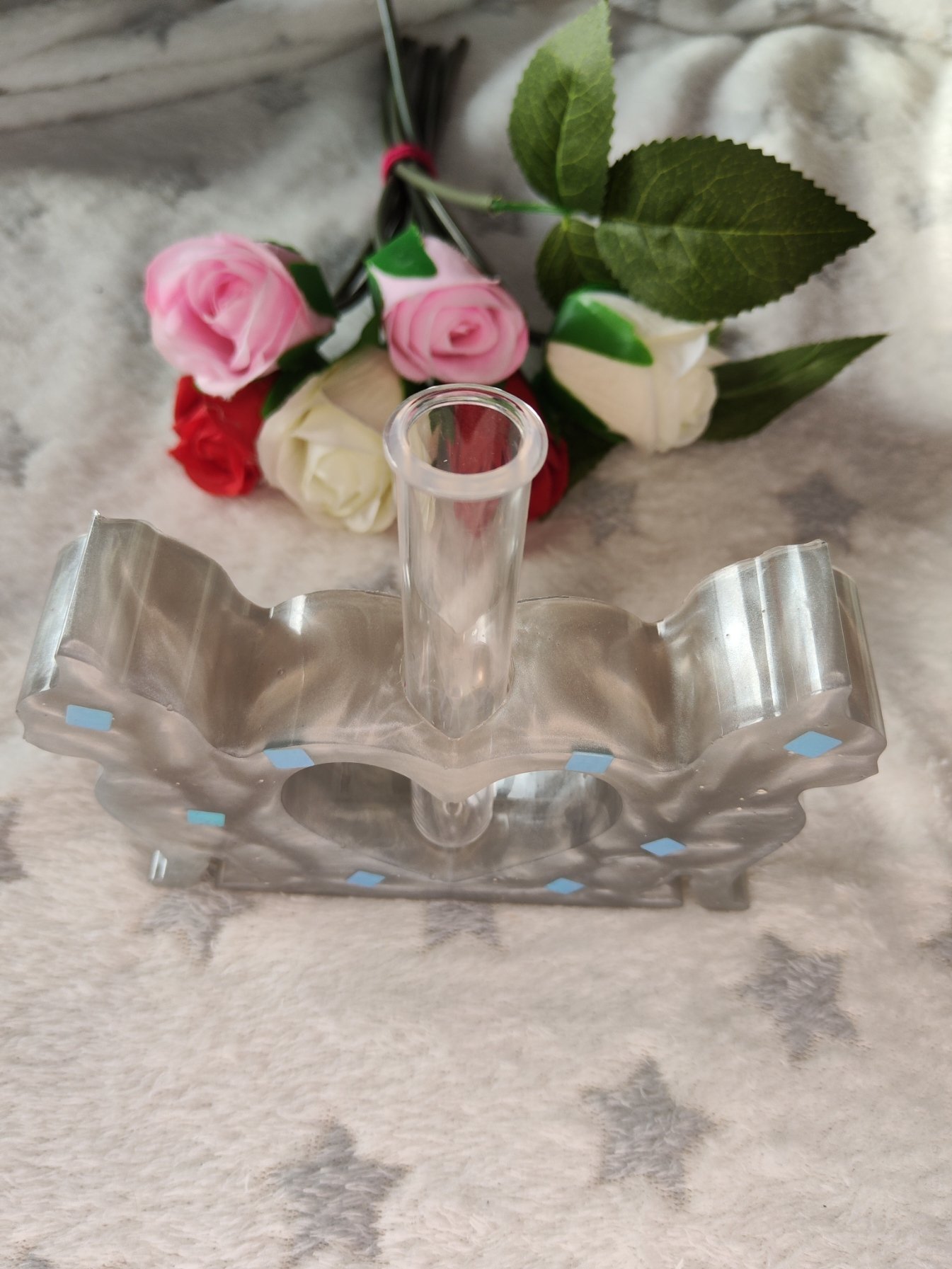 Ajoutez une touche d’élégance et de douceur à votre intérieur avec ce magnifique soliflore en résine, façonné à la main. Cette merveille grise avec paillettes bleues est non seulement une œuvre décorative unique, mais aussi un objet pratique grâce à sa forme pouvant servir de soliflore.